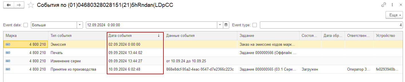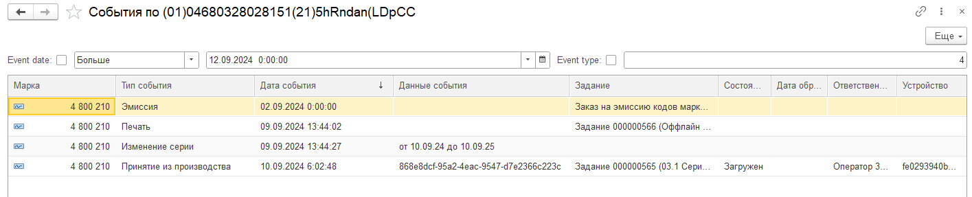 Проверь события по кодам маркировки, которые пришли с устройств в базу 1С, для этого: