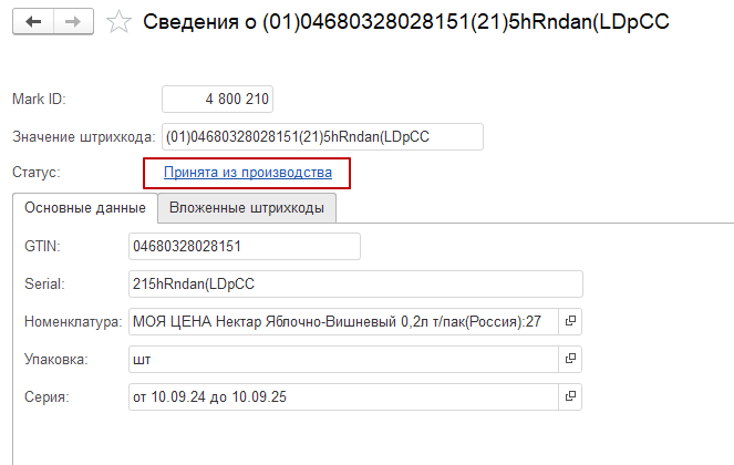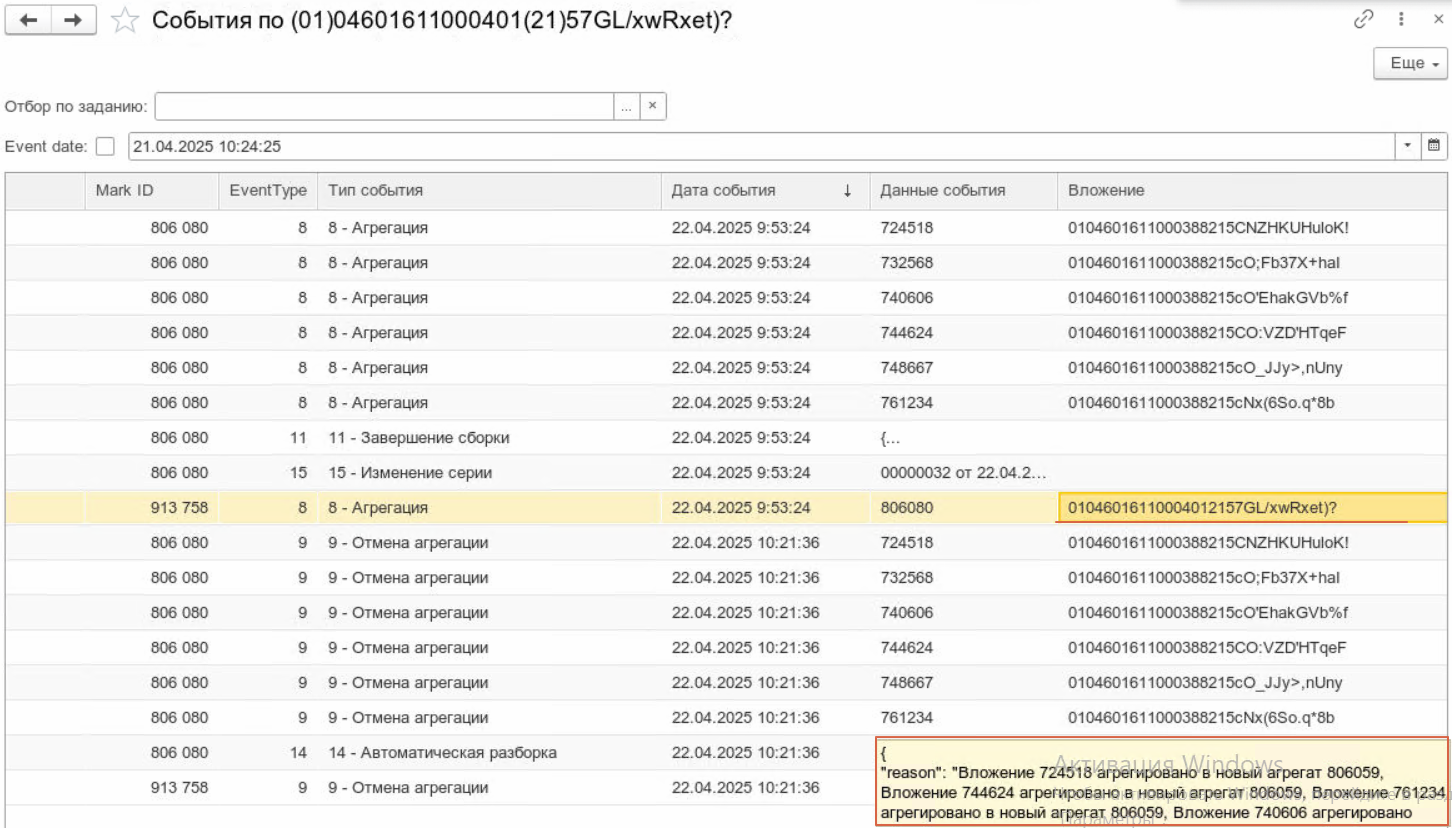 - Двойной клик на строке "Автоматическая разборка" - читайте текстовое поле, в котором написано "Вложение "MarkID" агрегировано в "MarkID". Это означает, что вы достали код из одной паллеты и положили в другую. А из прошлой автоматически ее изъял ЧЗ.