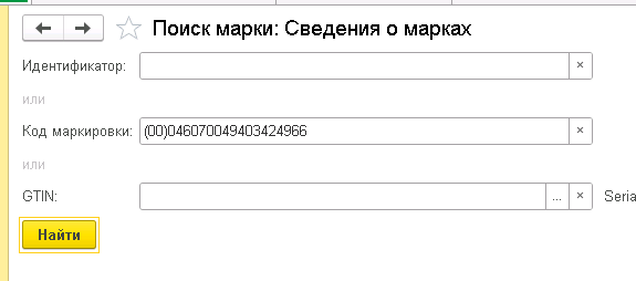 - введи "Идентификатор", "Код маркировки" или "GTIN" + "Serial" выполни команду "Найти"