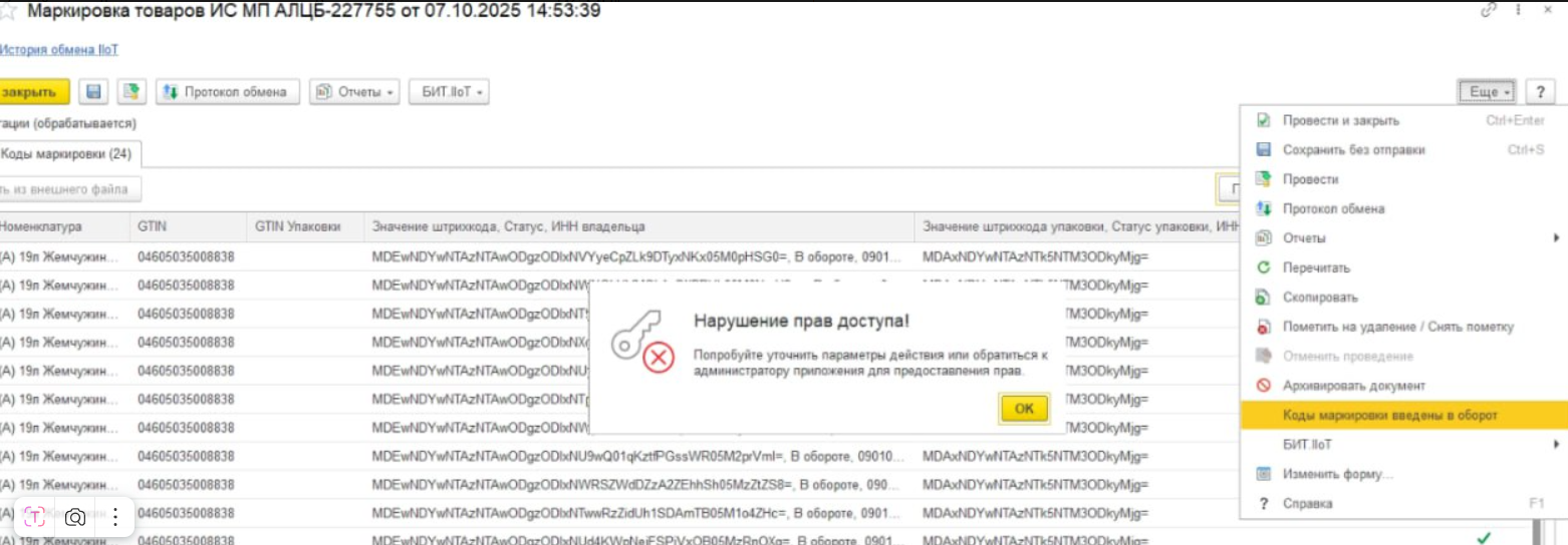 После нажатия "Коды маркировки введены в оборот" возникает сообщение - "нарушение прав доступа"