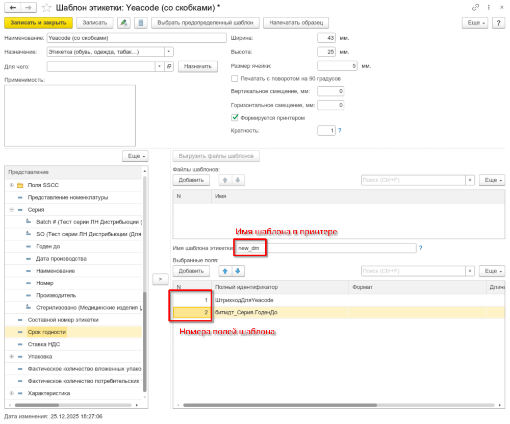 2. Для каждого динамического поля, используемого на шаблоне принтера (id1, id2 и т. д.), укажите, какое значение из 1С в него передавать (например: код маркировки, наименование, дата, цена).