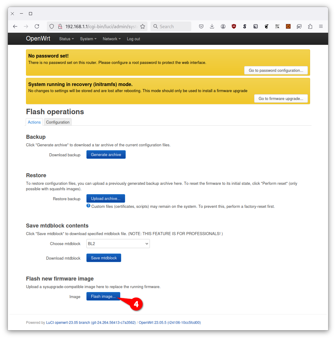 Если, все же, вам повезло - не упускайте удачу и закрепите успех. Авторизуйтесь в OpenWRT (пароль пустой) и перейдите в System -> Backup/Flash Firmware. Нажмите Flash image...4, выберете файл прошивки openwrt-23.05.5-mediatek-filogic-xiaomi_mi-router-ax3000t-squashf_hRpKAfo.bin, в появившихся окнах нажмите Upload и Continue