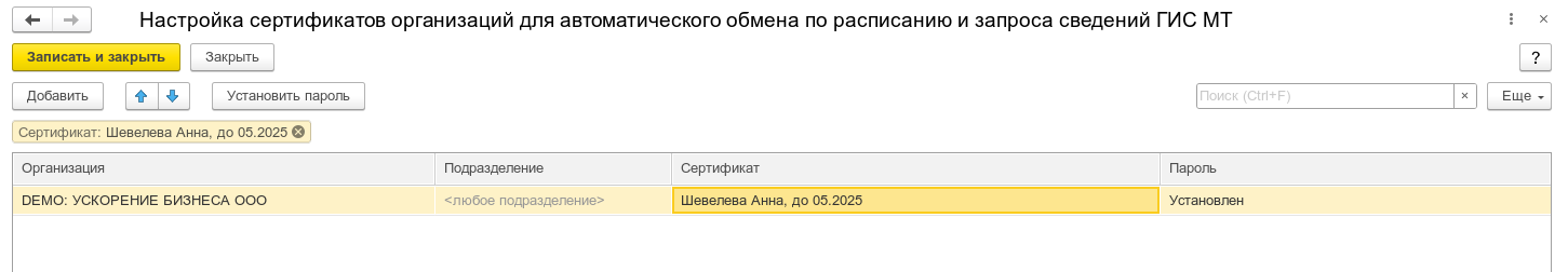 - В базе 1С открыть настройку сертификатов организации для автоматического обмена с ГИС МП (раздел НСИ и администрирование - Интеграция с ИС МП (обувь, одежда, табак..) - Сертификаты для подписания сообщений и авторизации на сервере)