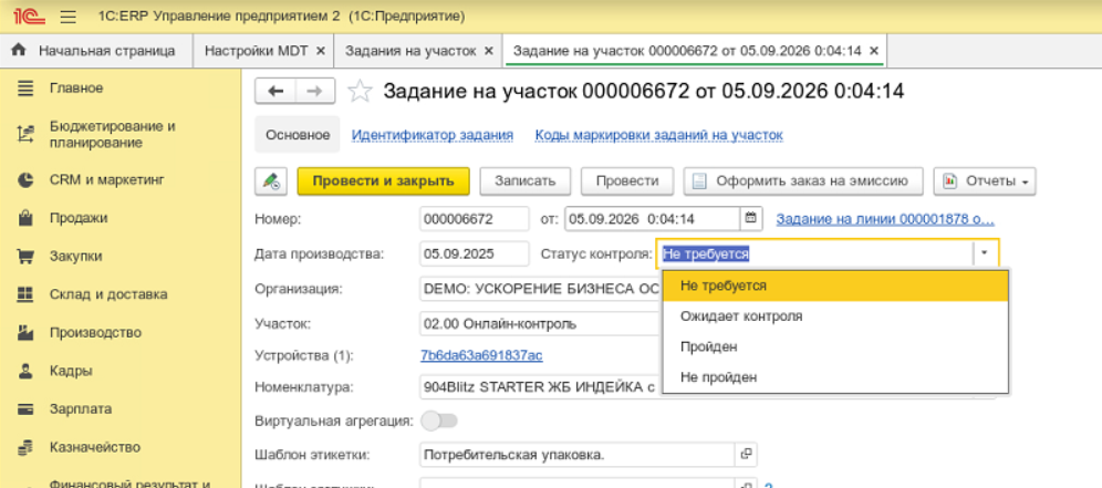 5. Если требуется ввести в оборот уже произведенную часть, установите статус контроля в значение "Пройден" и проведи документ.