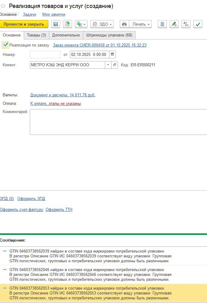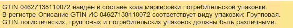 - GTIN найден в составе кода маркировки потребительской упаковки.