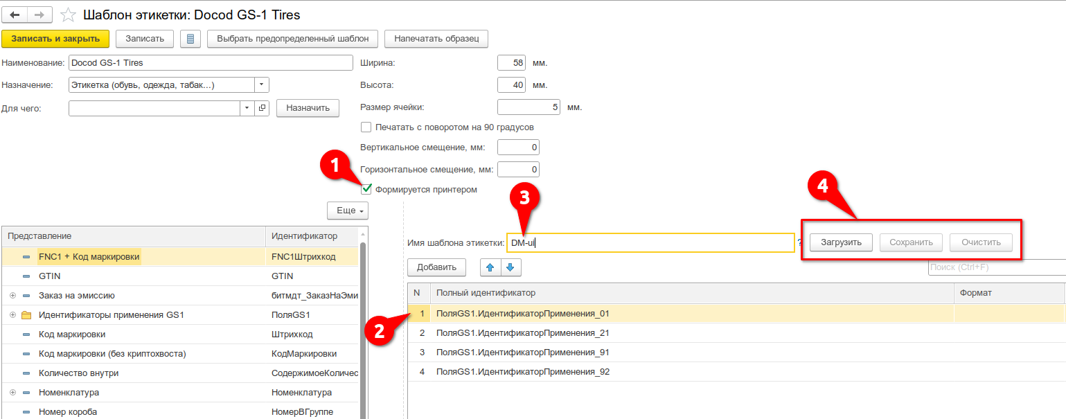 1. Установить галку Формируется принтером (1). Геометрические параметры этикетки и смещения не влияют на конечный результат.