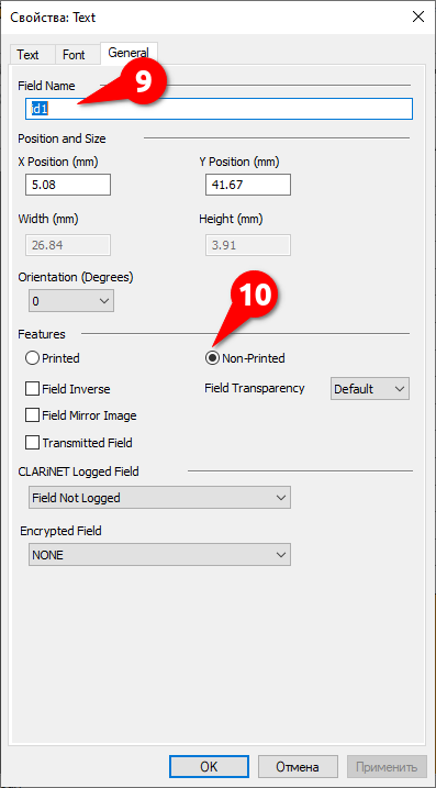 Идентификатор поля задается на вкладке General (8) в поле Field Name (9). Идентификаторы вида idX будут заменены информацией переданной из 1С, остальные идентификаторы будут выведены так, как они выглядят на шаблоне.