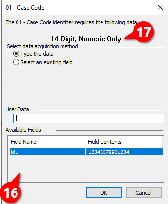 При редактировании свойств идентификатора применения из поля (16) выберете идентификатор текстового поля, значение которого будет использовано в настраиваемом идентификаторе применения. Доступность полей для выбора ограничена условиями (17), если текстовое поле не соответствует этим условием оно не будет показано в окне выбора.