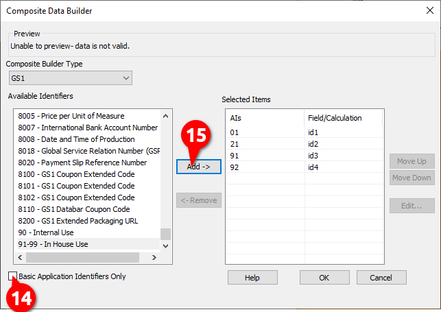 Снимите галку Basic Application Identifiers Only (14), чтобы увидеть все идентификаторы применения GS1, и перенесите (15) нужные идентификаторы в нужном порядке вправо.