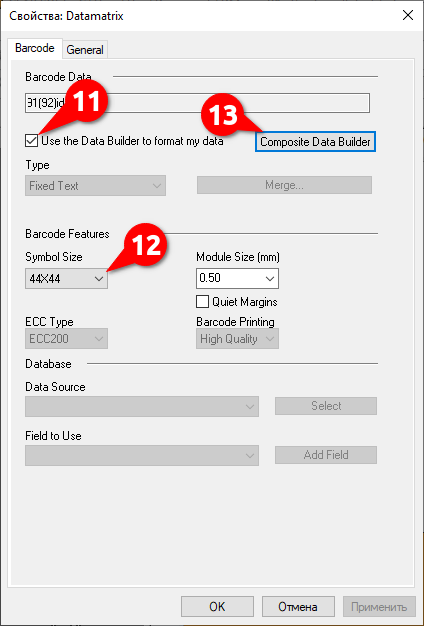 В свойствах поля Primary barcode установите галку (11), выберете желаемый размер кода в модулях (12) и перейдите в Composite Data Builder (13)